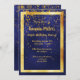 A festive and elegant 50th birthday party invitation card. A dark midnight blue background colour and a faux gold frame. With a golden confetti rain. Templates for your party information, golden letters. The blue colour is uneven.