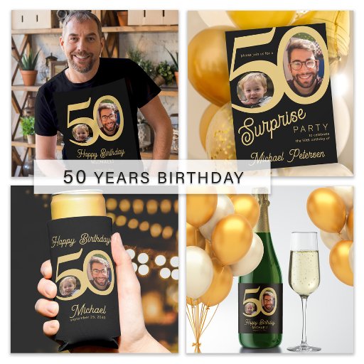 Trendy bold typography 50 years man birthday funny personalized t-shirt template with 2 photos and modern retro style script. Easy to customize with your text and pictures.