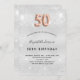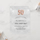A modern, stylish and glamourous invitation for a 50th birthday party. A faux silver looking background, decorated with glitter dust. Personalize and add your name nad party details. Number 50 is written with a rose gold balloon style font, script.