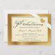 Create your own personalized 50th Wedding Anniversary Party Invitations -- Beautiful gold-tone metallic and ivory parchment look with [printed] white ribbon and golden gemstone bling heart. Classic engraved-look typography with fancy vintage style swash script lettering -- Elegant, affordable luxury, and uniquely customized for you! Just add the names, date, and details for your special milestone anniversary celebration. **NOTE: All elements of this design are part of the PRINTED image -- the ribbon, jewelled brooch, and frame are NOT raised, embossed, or presented as real embellishments. Sized for small invitation cards. Click "Customize It" to change the size, paper options, or font choices. Other sizes and styles available in gallery. © Teri Francis. Coordinating sets with matching postage and thank you cards available upon request.