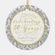 Golden 50th wedding anniversary personalized ornament. Gold, silver and white damask and hearts and the words celebrating 50 years in a fancy script font with flourishes. Personalized with your names and wedding date. Ink is silver and gold coloured, but not metallic.