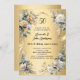 A faux gold looking background. Decorated with white and yellow florals and a golden ribbon. Personalize and add your names and details.