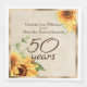 These elegant 50th golden wedding anniversary celebration napkins feature a beautiful watercolor floral theme. Two bouquets of sunflowers are printed on either side of the text. A gold frame borders the text area. The background is a rustic parchment paper pattern. Two sample names are printed above the 50 Years. You can personalize these to include your own names and anniversary year.