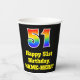 This colourful and fun birthday paper cup design features a large number “51” having a rainbow spectrum gradient inspired pattern. It also features the message “Happy 51st Birthday,”, and a customizable name. It also has a black-coloured background. Colourful, vibrant paper cups like this might be fun to use at a birthday party being held to honour somebody’s fifty first birthday. [~Z0000537]