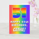 The front of this joyful and fun birthday-themed greeting card design features a large number “51” with a rainbow spectrum inspired gradient pattern, along with the message “HAPPY 51st BIRTHDAY,”, and a personalized name. The background on the front also has an exciting multicolored rainbow spectrum gradient pattern. The inside has a custom birthday greeting message, or could perhaps be cleared and left blank if a message is to be written by hand instead. A joyful, customized birthday greeting card like this might be used to celebrate somebody’s fifty-first birthday. [~Z0000570]