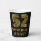 This Roaring Twenties inspired and vintage appearance birthday paper cup design features a large art deco inspired appearance number “52”, in addition to the birthday greeting message “Happy 52nd Birthday,” and an editable name. The background is coloured black. Roaring Twenties inspired paper cups like this might be used when hosting a birthday party for somebody in celebration of their 52nd birthday. [~Z0000546]