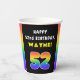 This fun and cheerful birthday paper cup design features a big number “52“ with a multicolored rainbow spectrum inspired gradient pattern, along with the message “HAPPY 52nd BIRTHDAY,”, and a custom recipient name. Birthday themed paper cups like this might be used at a birthday party celebrating somebody’s fifty second birthday. [~Z0000639]