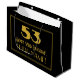 This vintage look 1920s-1930s appearance inspired birthday-themed gift bag design features a large art deco look inspired number "53", the message "Happy 53rd Birthday,", a customizable name, and a border pattern consisting of thin lines. It has a black-coloured background. A gift bag like this might be used when giving a gift or present in honour of somebody’s fifty third birthday. [~Z0000501]