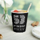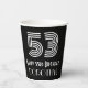 This 1920s/1930s style inspired and vintage appearance birthday themed paper cup design features a large art deco inspired look number “53”, plus the birthday greeting message “Happy 53rd Birthday,” and a personalized name. It also has a black-coloured background. Paper cups like this might be used at a birthday party for somebody who is celebrating their 53rd birthday. [~Z0000542]