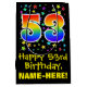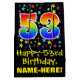This exciting, fun, and colourful birthday-themed gift bag design features a large number "53" with a rainbow spectrum gradient style pattern, along with the message "Happy 53rd Birthday,", and a personalized recipient name. It also has a colourful background pattern featuring star shapes of various sizes. A birthday themed gift bag like this might be used when giving a gift or present in celebration of somebody’s 53rd birthday. [~Z0000510]