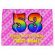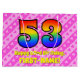 This upbeat and cheerful 53rd birthday themed gift bag design features a large number "53" having a rainbow spectrum inspired gradient pattern. It also features the message "Happy 53rd Birthday,", and a custom name. The background features a pattern of light pink and dark pink stripes containing loving pink heart shapes. Gift bags like this might be used when wrapping presents or gifts being given to celebrate somebody’s fifty third birthday. [~Z0000414]