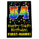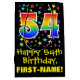 This colourful, fun, and exciting birthday gift bag design features a large number "54" with a rainbow spectrum gradient inspired pattern, along with the message "Happy 54th Birthday,", and an editable recipient name. It also has a colourful background pattern featuring star shapes of various sizes. A birthday themed gift-bag like this might be a fun way to wrap a gift or present being given to somebody who is celebrating their fifty fourth birthday. [~Z0000510]