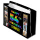 This upbeat and eye-catching birthday gift bag design features the message “HAPPY 54TH BIRTHDAY,“ with the text having a multicolored rainbow spectrum inspired gradient pattern, along with a custom recipient name. The photos to the left and the right of the rainbow-patterned message on the front of the card can be personalized, perhaps with photos of the recipient, the recipient’s family and friends, and/or the sender(s) of the gift. A eye-catching birthday themed giftbag like this might be a fun way to wrap a gift being given to somebody who is celebrating their fifty-fourth birthday. (Photography © Storytree Studios, Stanford, CA.) [~Z0000668]
