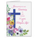 Feuilles verts, fleurs sauvages colorés, une grande croix bleue et des mots en rose. C'est la belle et élégante carte religieuse dont vous avez besoin pour vos félicitations pour un 55ème anniversaire. Une bonne religieuse qui aime Dieu et la nature aimera recevoir votre message de cette façon.