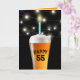 Candle in a cold glass of beer with light string on black background for 55th birthday.