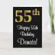 This elegant, luxurious, and sophisticated birthday greeting card design features a large ordinal number “55th” having an imitation/faux gold-inspired appearance, plus the birthday greeting message “Happy 55th Birthday,” and an editable name in a script-style font on the front. The background of the front is coloured black. The inside has a customized birthday greeting message, or could perhaps be cleared and left blank if a message is to be written by hand instead. A luxurious editable birthday greeting card like this might be a fun way to send a birthday greeting message to somebody who is celebrating their fifty-fifth birthday. [~Z0000518]