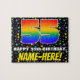 This vibrant and fun birthday jigsaw puzzle design features a large number “55” with a multicolored rainbow spectrum inspired gradient pattern, along with the message “HAPPY 55th BIRTHDAY,”, and a customizable recipient name. The background features a joyful, multicolored star field pattern. An eye-catching, editable birthday puzzle like this might be used to celebrate somebody’s fifty-fifth birthday. [~Z0000607]