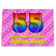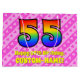 This upbeat and happy 55th birthday-themed gift bag design features a large number "55" having a rainbow spectrum inspired gradient pattern. It also features the message "Happy 55th Birthday,", and an editable name. The background features a cheerful pattern of dark pink and light pink stripes containing loving pink heart shapes. A gift bag like this might be used when wrapping presents or gifts being given to somebody who is celebrating their fifty fifth birthday. [~Z0000414]