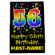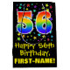 This vibrant, colourful, and exciting birthday-themed gift bag design features a large number "56" with a rainbow spectrum gradient style pattern, along with the message "Happy 56th Birthday,", and a custom recipient name. It also has a background pattern featuring star shapes of various sizes and colours. A birthday themed gift-bag like this might be a fun way to wrap a gift or present being given to somebody who is celebrating their fifty sixth birthday. [~Z0000510]