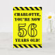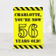 The front of this attention-grabbing and bold birthday-themed greeting card design features a customizable name and the message "YOU’RE NOW 56 YEARS OLD!" in black stencil inspired text on a yellow coloured background. The front also features an eye-catching black and yellow striped pattern at the top and bottom edges. The inside features a customizable birthday greeting message, or could perhaps be cleared and left blank if a message is to be written by hand instead. A personalized birthday card like this might be a fun way to send a message in celebration of somebody’s fifty sixth birthday. [~Z0000413]