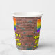 This fun and exciting urban graffiti and street art inspired birthday paper cup design features a large number “57” having a colourful rainbow spectrum gradient inspired pattern. It also features the message “Happy 57th Birthday,”, and a customizable name. The background has a brick wall pattern. Colourful, vibrant paper cups like this might be fun to use at a birthday party being held to celebrate somebody’s 57th birthday. [~Z0000543]