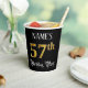 This luxurious and fancy birthday paper cup design features a personalized name and the message “57th Birthday Party”. The large number “57th” has an imitation/faux gold-inspired colouring pattern, the words “Birthday Party” are in elegant script-style text, and the background is coloured black by default (although it can be customized). Elegant, ornate paper cups like this might be used at a birthday party/celebration being held to celebrate somebody’s 57th birthday. [~Z0000567]