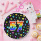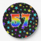 This colourful, fun, and cheerful paper plate design features a large number "57" containing a rainbow spectrum gradient inspired pattern colouring. The background features a colourful star shapes pattern. Paper plates like this might be used at a party celebrating somebody’s 57th birthday, or a couple’s fifty seventh anniversary, or some other 57th event. [~Z0000493]