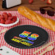This colourful, fun, and cheerful birthday-themed paper plate design features a large number "58" and the message "HAPPY BIRTHDAY,", both having a rainbow spectrum gradient inspired pattern colouring, along with a bold yellow customizable name. The background is coloured black. Fun, editable paper plates like this might be used at a party being held to celebrate somebody’s 58th birthday. [~Z0000488]