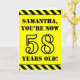 The front of this fun and bold birthday-themed greeting card design features a custom name and the message "YOU’RE NOW 58 YEARS OLD!" in black stencil style text on a yellow coloured background. The front also features an eye-catching black and yellow striped pattern at the top and bottom edges. The inside features a customizable birthday greeting message, or could perhaps be cleared and left blank if a message is to be written by hand instead. A custom birthday card like this might be a fun way to send birthday wishes to somebody who is celebrating their fifty eighth birthday. [~Z0000413]