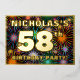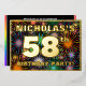 The front of this upbeat and vibrant fifty-eighth birthday celebration foil invitation card design features a customizable name, a large number “58th”, the message “BIRTHDAY PARTY!”, and a border. The background of the front features a fun, multicolored bursting celebratory fireworks-inspired pattern. The back features personalized details about the event, such as the date, time, venue/place, and any other important information. Personalized invitations like these might be a fun way to invite guests/attendees to a birthday gathering/party being held in celebration of somebody’s 58th birthday. [~Z0000602]