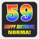 This colourful, fun, and cheerful birthday themed sticker design features a large number "59" and the message "HAPPY BIRTHDAY,", both having a rainbow spectrum gradient inspired pattern colouring, along with a bold yellow editable name. The background is coloured black. Fun stickers this might be used when wrapping a gift or present in honour of somebody’s 59th birthday, or perhaps might be handed out to the attendees at a birthday celebration. [~Z0000480]