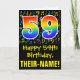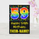 The front of this fun, colourful, and vibrant birthday themed greeting card design features a large number "59" having a rainbow spectrum gradient inspired pattern. It also features the message "Happy 59th Birthday,", and a personalized recipient name. The front also features a pattern of various music notes and symbols having a variety of colours and sizes. The inside features a custom birthday greeting message, or could perhaps be cleared and left blank if a message is to be written by hand instead. A birthday card like this might be a fun way to send birthday wishes to a musician, singer, composer, or somebody else who is celebrating their fifty ninth birthday. [~Z0000420]