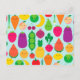 A pattern of happy colourful fruit and vegetables on a blue background, including a peach, banana, pineapple, watermelon, pear, cherries, radish, aubergine (eggplant), brussels sprout, peas, radish and red pepper (bell pepper).