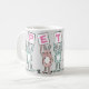 Fun Rabbit Design Mug pour quelqu'un avec un nom de 5 lettres. Le nom de l'exemple est Peter. De mignons lapins bébés. Mug blanc amusant avec l'illustration de lapins en rose et bleu. Les lapins tiennent des cartes pour épeler le nom.