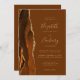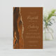The left-hand edge of this elegant modern wedding invitation features a burnt orange and rust watercolor agate border trimmed with faux gold glitter. The customizable text combines gold-coloured handwriting, copperplate and italic fonts on a nutmeg brown background. The reverse side provides spaces for 5 photos (3 horizontal 1 square and 1 vertical) and room for your wedding website URL or other brief message.
