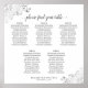 Ce tableau de sièges mariage de 5 tables aidera vos invités à trouver la bonne table à votre réception. Le design est à la fois simple et élégant, avec du texte gris foncé sur un arrière - plan blanc et un faux fil argenté en dentelle dans les coins. Le titre dit "s'il vous plaît trouvez votre table" dans une élégante calligraphie de script. Sophistiqué et chic. Comprend l'assignation de table pour 50 personnes avec 10 sièges par table.