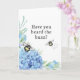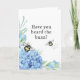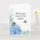 Beautiful greeting card - bumble bee with blue hydrangeas; blank inside, ready for your own messaging.