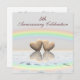5th wood anniversary invitation with an image of two wooden hearts floating on the water under a rainbow.