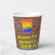 This fun and vibrant urban street art and graffiti themed birthday paper cup design features a large number “5” with a colourful rainbow spectrum gradient inspired pattern, along with the message “Happy 5th Birthday,”, and a customizable name. The background has a brick wall pattern. Colourful, vibrant paper cups like this might be fun to have at a birthday party being held to celebrate somebody’s fifth birthday. [~Z0000543]