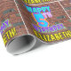 This fun birthday themed wrapping paper design features the message “HAPPY 5TH BIRTHDAY,” having a colourful, vibrant, graffiti and urban street art inspired appearance, along with a custom recipient name. The background features a pattern inspired by the look of a brick wall. Personalized birthday themed wrapping paper like this might be a fun way to wrap a gift or present being given to celebrate somebody’s fifth birthday. [~Z0000533]