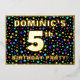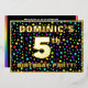 The front of this exciting fifth birthday celebration foil invitation card design features an editable name, a large number “5th”, the message “BIRTHDAY PARTY!”, and a border. The background of the front has a vibrant, multicolored stars pattern. The back features personalized details about the event, such as the date, time, place/venue, and any other important information. Customizable invitations like these might be a fun way to invite attendees/guests to a birthday gathering being held to celebrate somebody’s 5th birthday. [~Z0000600]