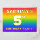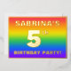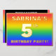 The front of this fun and upbeat fifth birthday celebration/party foil invitation card design features an editable name, a large number “5th”, the message “BIRTHDAY PARTY!”, and a border. The background of the front has a joyful, multicolored, rainbow spectrum inspired gradient pattern. The back features personalized details about the event, such as the date, time, place, and any other important information. Personalized invitations like these might be a fun way to invite attendees/guests to a birthday party being held to honour somebody’s 5th birthday. [~Z0000599]