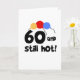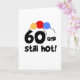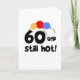 Primary colours balloons and black text that reads "60 and still hot!" on 60th birthday T-shirts, mugs, buttons, cards, and other birthday gear!