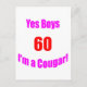 Yes Boys (60) I'm a Cougar! Humourous 60th birthday design that lets the young men know there is a cougar in their midst. Makes a great 60th birthday gift for the 60 year old woman who loves younger men.