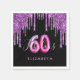 A trendy and glamourous 60th birthday party paper napkin. A classic black background decorated with dark purple coloured faux glitter drips, paint dripping look. With the text: 60 and fabulous. Personalize and add a name. Purple and hot pink coloured text. The word Fabulous is written with a modern hand lettered style script. Age 60 is written with a balloon style script.