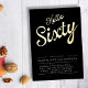 Faites une déclaration et faites-la forte avec cette invitation amusante et vibrante en papier noir et or à 60e anniversaire. Célébrez une étape spéciale avec ce design unique avec les mots 'Hello Sixty' mis sur un fond noir. Idéal pour une affaire glamour et luxueuse, ces invitations étonnants sauront impressionner tous vos invités. Ne manquez pas cette occasion remarquable de rendre votre journée spéciale inoubliable !