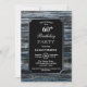 Une invitation rustique bordée d'argent en bois de grange bleu 60ème anniversaire avec le texte blanc mis en surbrillance sur un arrière - plan noir.