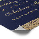 Un design vintage pour un mariage élégant. L'arrière - plan est bleu marine. Il a des bordures fleuries dorées avec des décorations roses sauvages complexes. L'occasion et le nom sont écrits dans un élégant script calligraphique, le reste en casquette. Tout le texte peut être personnalisé et a une couleur dorée semblable aux roses d'or sur les frontières. Le message d'accueil est un texte archivé au-dessus de l'âge. Les décorations roses d'or sont tirées d'une couverture vintage de 1912, de l'ouvrage Complete Poetical Works de Geoffrey Chaucer, désormais dans le domaine public.