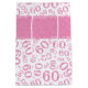 This over-the-hill numeric design is a pink and white random number pattern with a pink milestone number 60 repeated in varied sizes and angles over a white background. There is a printed banner and a gift tag with text templates so you can easily personalize any or all of the text.