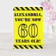 The front of this fun and attention-grabbing birthday themed greeting card design features an editable name and the message "YOU’RE NOW 60 YEARS OLD!" in black stencil look text on a yellow coloured background. The front also features an eye-catching black and yellow striped pattern at the top and bottom edges. The inside features a customizable birthday greeting message, or could perhaps be cleared and left blank if a message is to be written by hand instead. A customizable birthday card like this might be a fun way to send a message in celebration of somebody’s sixtieth birthday. [~Z0000413]